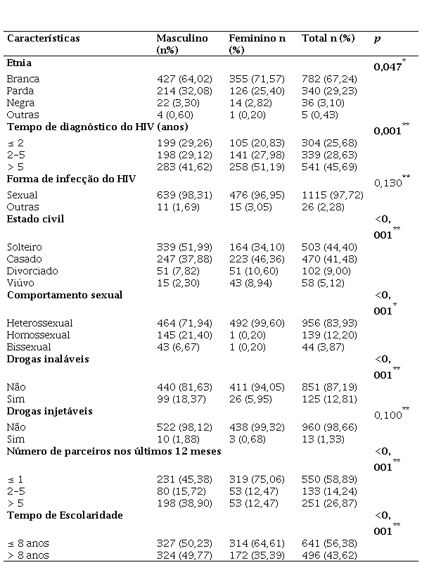 Em relação as variáveis sociodemográficas e relacionadas aos fatores de risco para aquisição da infeção pelo HIV, pacientes com etnia branca, infecção do HIV por via sexual, solteiros, tempo de diagnóstico superior a cinco anos, comportamento heterossexual, não usuários de drogas injetáveis (UDI) e inaláveis, com até um parceiro sexual nos últimos doze meses e educação menor/igual a oito anos, foram os mais acometidos. A relação dessas variáveis, separadas pelo sexo, estão demonstradas na Tabela 1.