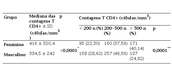 Do total de pacientes pertencentes à região do estudo com idade maior/igual a 18 anos, 978 (82,60%) realizaram exames de contagens de células TCD4+. A mediana da contagem de células TCD4+ foi significativamente maior no sexo feminino quando comparado ao masculino (µ= 416 células/mm3–±320,4 versus .vs.) µ = 334,5 células/mm3 –±242, respectivamente) (p<0,0001). A maioria das mulheres (40,14%), quando comparados aos homens (24,82%), possuía contagem de células TCD4+ no diagnóstico do HIV superior a 500 células/mm3 (Tabela 2).