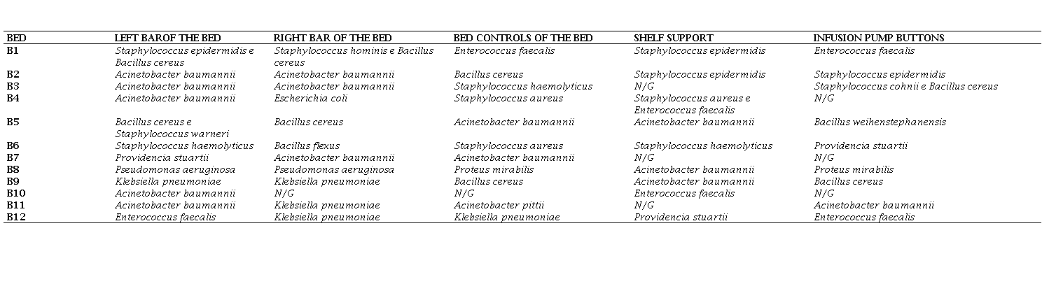 The collections of inanimate surfaces were performed by convenience sampling from five pre-defined surfaces of the ICU bed (right and left bars of the beds, bed control buttons, bedside table and buttons from the infusion pump). The inclusion criterion was samples from surfaces whose beds were occupied by their respective patients with positive blood culture indication by BD BACTEC™ Instrumented Blood Culture Systems. The obtainment of samples was performed by using moistened sterile swabs on Tryptic Soy Broth (TSB), that immediately after the collection were stored in tubes containing the broth and incubated in a greenhouse at a temperature of 37ºC for 24 hours for analysis of the bacterial growth. After checking the turbidity in TSB was performed by seeding exhausted in blood agar and MacConkey, incubated in 37ºC for 24 hours.