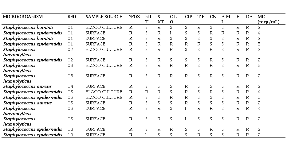 The antibiograms analyzed showed profile resistance of 21 strains Gram positive, the group of Staphylococci, 13 (61.9%) isolated on surfaces of samples, and 8 (38.09%) of blood cultures. Of these, 16 (76.19%) were resistant to cefoxitin (surrogate marker for detection of oxacillin resistance), are classified as ORSA/ORCNS, respectively (Table 2).