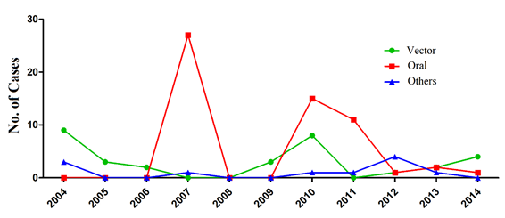 According to the ways of contamination described from 2004 to 2014, oral contamination was highlighted in 2007, in relation to the other years (Figure 2).
