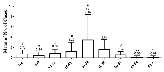 The variable age group presented the highest occurrence between 15 and 59 years old, as it can be observed in Figure 3. It was possible to observe that the age groups with the highest occurrences were: 20-39, 40-59 and 15-19, respectively. The other age groups obtained means less than one case per year. The means values, when compared, present significance (p<0.01) in relation to the mean of 20-39 (3.45**), 65-69 (0.09**) and 80+ (0.09**). In relation to the others, the significance.