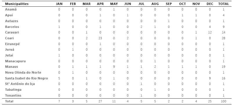 The state of Amazonas, from 2004 to 2014, had an annual mean of 9 cases of CD. This is considered low when compared to the Brazilian state of Pará, with a mean of 119,14 which reinforces the hypothesis that the data form this study may be underreported, considering that in the state of the Amazonas the access to health services is limited and often far from the communities. Within this mean, related to the months, there was no statistical significance. However, it was possible to observe that in relation to seasonality, in April and December, there were higher annual means of cases in Amazonas due to the fact that in April there was an outbreak through oral transmission of 25 cases in Coari-AM15, and in December it may be related to the production of açaí .Euterpe oleracea), that in this region of the Amazonas estuary, harvesting is more expressive from August to January.16