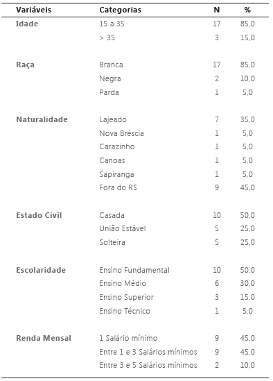 Participaram da pesquisa 20 gestantes, atendidas num Centro Especializado de Saúde da Mulher de uma UBS do município de Lajeado/RS (Tabela 1). A maioria delas (85%) são jovens e adultas de 15 a 35 anos, brancas (85%), naturais de Lajeado (35%), casadas ou em união estável (75%), com ensino fundamental ou médio (80%).