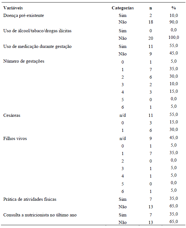 Um total de10% das gestantes participantes da pesquisa relatou doença prévia, contudo, 55% utilizavam medicação durante a gestação (Tabela 2). A maioria estava em sua primeira gestação (35%). Chama a atenção que 65% não praticavam atividade física e também 65% não consultaram nutricionista no último ano, mesmo que o serviço esteja disponível na Estratégia de Saúde da Família das participantes.