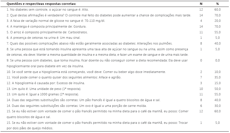 No que se refere à temática da questão oito, as gestantes acertariam se soubessem que, se uma pessoa que está tomando insulina e apresenta uma taxa alta de açúcar no sangue ou na urina, assim como presença de cetonas, ela deve: manter a mesma quantidade de insulina e a mesma dieta, e fazer um exame de sangue e de urina mais tarde. Na questão nove, as gestantes eram solicitadas a responder o que fazer quando uma pessoa com diabete está tomando insulina e fica doente ou não consegue comer a dieta receitada. A pessoa deve usar hipoglicemiante oral para diabetes ao invés de insulina. Na questão 15 abordou-se a substituição de alimentos e, mais uma vez, as gestantes demostraram desconhecimento sobre a temática. Assim, se uma pessoa não estiver com vontade de comer o pão francês permitido na dieta para o café da manhã, a resposta adequada seria: trocar por dois pães de queijo médios.