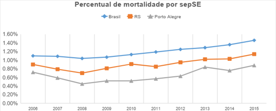A Figura 1 apresenta o percentual de mortalidade por sepse no Brasil, RS e Porto Alegre. O gráfico apresenta um crescimento constante no período avaliado. No Brasil, a taxa de mortalidade em 2006 foi de 1,10% e em 2015 de 1,46%. No RS, em 2006 foi 0,90% e em 2015 foi de 1,14%; e em Porto Alegre, no ano de 2006 foi 0,72% e em 2015 foi de 0,88%. O percentual de Porto Alegre manteve-se abaixo dos valores do RS e do Brasil.