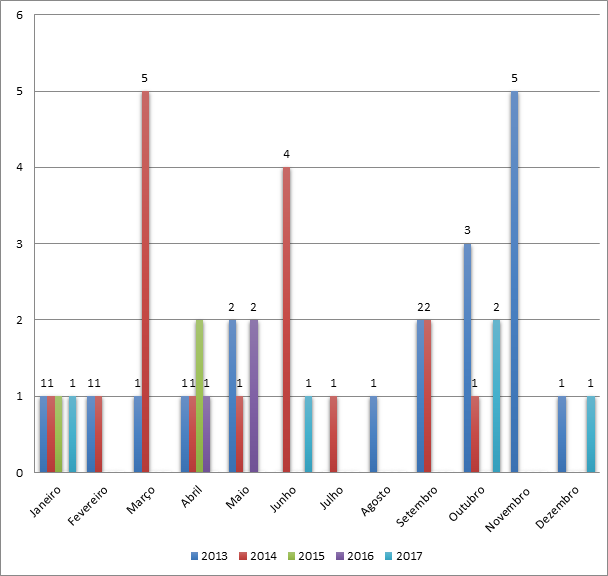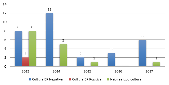 No ano de 2013, 8 casos foram descartados após exame de cultura negativa e 8 não realizaram exames. Em 2014, 12 casos tiveram cultura negativa e 5 casos não realizaram cultura. Em 2015, 2 casos deu cultura negativa e 1 caso não realizou exame de cultura. Em 2016 apenas 1 caso suspeito descartado após cultura negativa. E no ano de 2017 6 casos com cultura negativa e 1 caso sem exames (Figura 3).