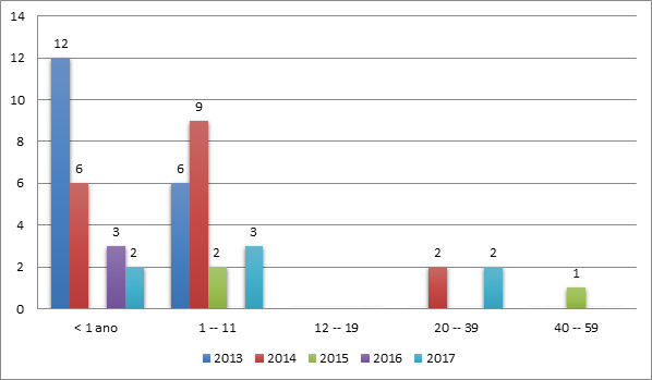 No ano de 2015 apenas ocorreram 3 casos suspeitos notificados, sendo 2 na faixa de 1 a 11 anos e 1 caso entre 40 e 59 anos. Em 2016 houveram apenas 3 casos em menores de um ano. Em 2017, 2 em menores de um ano, 3 entre 1 a 11 anos e 2 casos na faixa de 20 a 39 anos. Foi observado que a as faixas etárias mais acometidas são em menores de um ano e de 1 a 11 anos de idade (Figura 2).