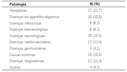 Quanto aos problemas de saúde responsáveis pela admissão hospitalar, conforme o CID-10, destacam-se as neoplasias, doenças cardiovasculares e respiratórias, conforme descrito na Tabela 1.