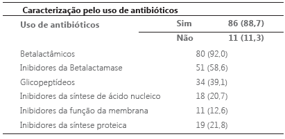 Quanto às classes farmacológicas de antibacteriano utilizadas, observa-se que a dos betalactâmicos foi a mais utilizada com 92% (n = 80), seguida dos inibidores da betalactamase com 58,6%. A utilização de classes de antibacterianos nas últimas duas semanas de vida é demonstrada na Tabela 2.