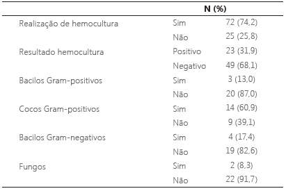 Durante a internação, 86,6% dos pacientes coletaram algum tipo de cultura, sendo que não foi encontrada associação entre a solicitação de cultura com a prescrição do antibiótico (p = 0,452). Conforme demonstrado na Tabela 3, a hemocultura foi realizada em 72 indivíduos correspondendo a 74,2% das amostras. Destes, 31,9% apresentaram resultado positivo, com maior prevalência de cocos Gram-positivos, representando 60,9% (n = 14), sendo que a solicitação de hemocultura não influenciou na tomada de decisão pelo uso de antibacteriano (p = 0,206). Ou seja, houve prescrição e manutenção de antibiótico independentemente do resultado da cultura.
