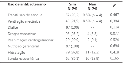 Cerca de 42,3% (n = 41) dos pacientes receberam transfusão sanguínea, 48,5% (n = 47) utilizaram ventilação mecânica, 12,4% (n = 12) fizeram diálise, 60,8% (n = 59) usaram alguma droga vasoativa e 92,8% (n = 90) receberam hidratação endovenosa. Cerca de 22,7% (n = 22) dos indivíduos foram submetidos à ressuscitação cardiopulmonar. Não foi encontrada associação entre o uso de antibacteriano e as outras medidas terapêuticas adotadas para o paciente (p = 0,05), porém 59,3% dos pacientes que usaram antibiótico foram submetidos a quatro ou mais medidas terapêuticas. A associação entre o uso de antibacteriano e medidas terapêuticas podem ser observados na Tabela 5.