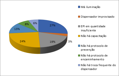 Dados do Ministério da Saúde (MS), indicam que os ferimentos com materiais perfurocortantes no âmbito hospitalar, são considerados imensamente perigosos devido ao alto potencial de transmitir uma grande variedade de patógenos.9 Neste estudo, dentre os profissionais entrevistados, a maioria dos acidentes com perfurocortantes ocorreu no momento da punção venosa, sendo a categoria de técnicos de enfermagem a mais acometida. Dentre os principais fatores que contribuem para a ocorrência destes agravos, destacam-se as condições ruins no ambiente de trabalho, como escassez de equipamentos de proteção individual, infraestrutura física, iluminação e superlotação do ambiente e a deficiência de educação permanente.