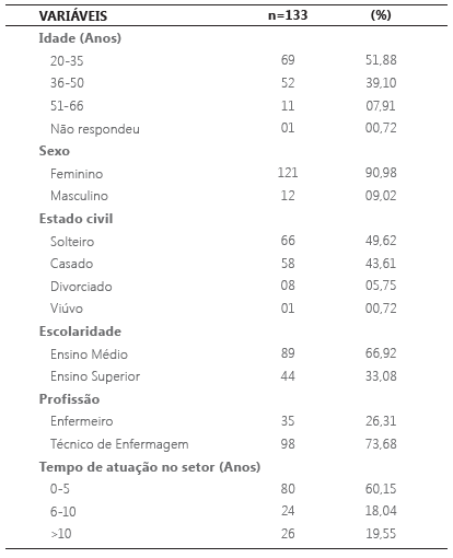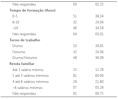 Em relação ao perfil social dos profissionais entrevistados, a maioria 51,88% (n=69) tem entre 20 a 35 anos; dos 133 profissionais entrevistados, 90,98% (n=121) são do sexo feminino, 49,62% (n=66) são solteiros; 66,92% (n=89) estudaram até o ensino médio; 32,08% (n=44) cursaram o ensino superior; 26,31% (n=35) são enfermeiros e 73,68% (n=98) são técnicos de enfermagem; 60,15% (n=80) trabalham no setor de urgência e emergência a menos de cinco anos; 62,04% (n=83) estão formados a menos de dez anos; já em relação ao turno de trabalho, 39,85% (n=53) trabalham no plantão diurno; 24,06% (n=32) no plantão noturno e 36,09% (n=48) trabalham nos dois plantões; 60,90% (n=81) destes profissionais tem a renda familiar de um até três salários mínimos. (Tabela 1)