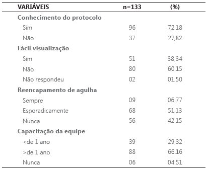 Dos profissionais entrevistados 72,18% (n=86) referem ter o conhecimento do protocolo da instituição de encaminhamento do profissional acidentado por perfurocortante, porém 60,15% (n=80) informam que o protocolo após acidentes com perfurocortantes não está disposto para a visualização da equipe. Destes profissionais, 51,13% (n=68) relatam que às vezes reencapam agulha, 42,15% (n=56) que nunca as reencapam e 06,77% (n=09) sempre reencapam. Já em relação a capacitação sobre o descarte de perfurocortantes 66,16% (n=88) dos participantes retratam que faz mais de um ano da última capacitação sobre tal assunto e 04,51% (n=06) dizem nunca participaram de tal (Tabela 2).