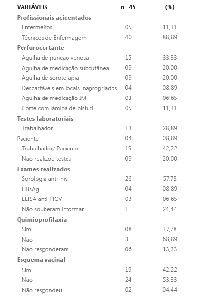 No presente estudo, a maioria dos dados indicam que 100% parte dos acidentes ocupacionais com perfurocortantes correspondeu a membros da equipe de enfermagem com predominância do sexo feminino, idade inferior aos 35 anos, corroborando com os achados de outros estudos.12,13