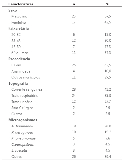 Observou-se que 23 (57,5%) pacientes eram do sexo masculino, 15 (37,5%) eram da faixa etária entre 60 anos ou mais, 25 (62,5%) eram procedentes de Belém. A infecção ocorreu na maioria das vezes na corrente sanguínea (41,2%) (Tabela 1).
