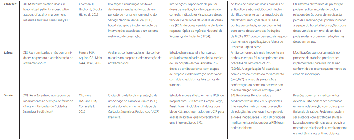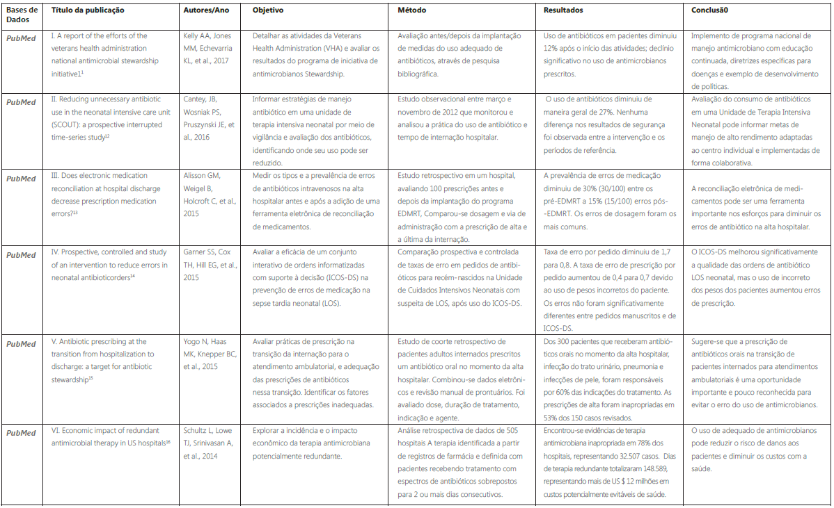 Analisando a literatura, identificaram-se publicações dos últimos cinco anos, abordando diversas perspectivas sobre o uso de antibióticos nos hospitais e a sua relação com o sucesso dos tratamentos, bem como evidenciando os erros ocorridos desde sua prescrição até sua administração. Essas publicações apontam a importância de cada profissional dentro de um cenário de trabalho interdisciplinar, além de relatar a importância do uso de sistemas informatizados para o auxílio na redução de erros de prescrição da medicação, seja na dosagem, no tipo de medicamento, na forma de administração, entre outros.