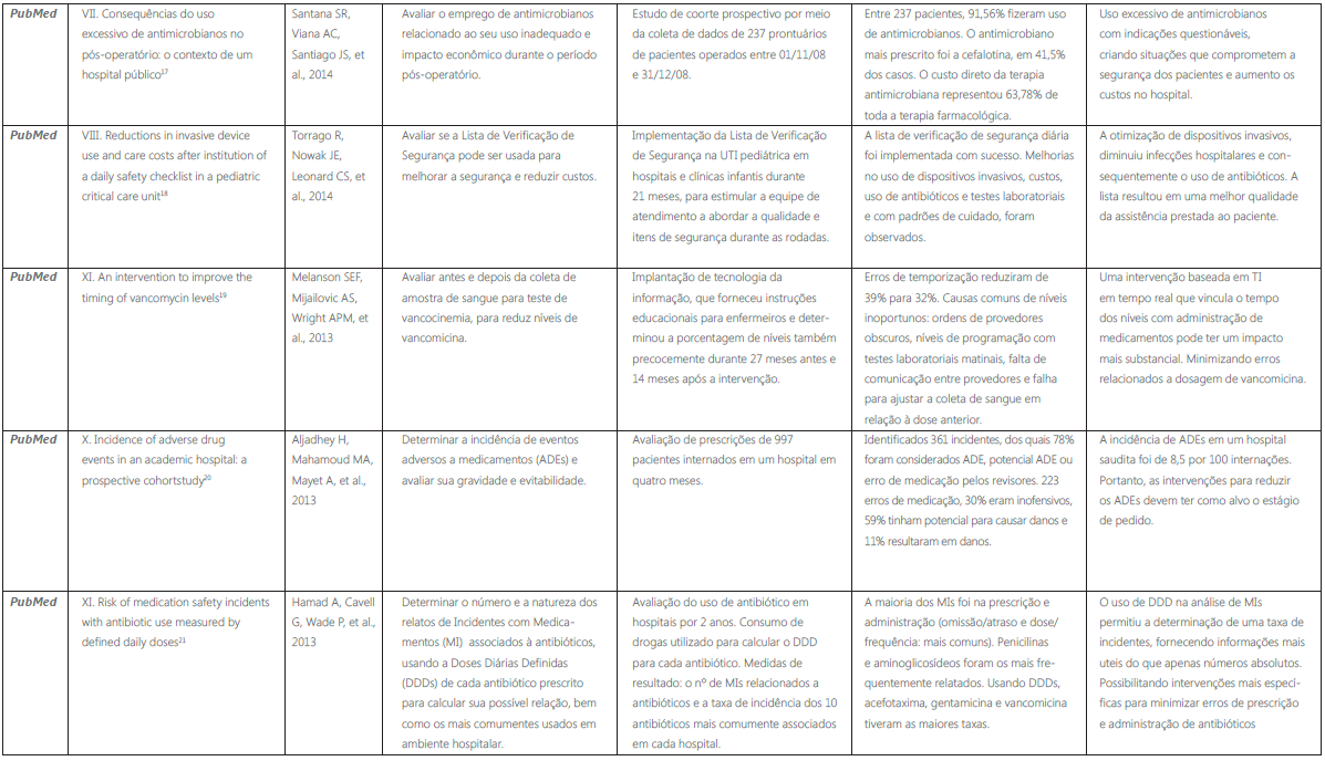 Embora os estudos analisados não abordem especificamente os erros de medicação, pode-se observar que a diminuição do uso de antibióticos está relacionada a redução dos erros de prescrição, dispensação e administração. Contudo, a utilização da tecnologia da informação, nas diversas instâncias do percurso do medicamento, é uma ferramenta imprescindível para monitorar o processo e evitar o erro. Outra ação de suma importância é a educação continuada, que se demonstrou efetiva para treinamentos de aprimoramento das equipes multiprofissionais, aliada a redução de indicadores de danos aos pacientes, principalmente no que se refere ao uso de antimicrobianos e resistência bacteriana.