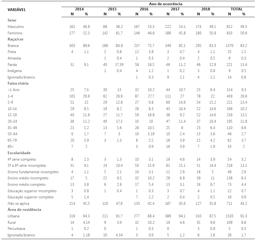 Para raça/cor, prevaleceu a branca com um total de 1370 casos (83,2%). Quanto à escolaridade, predominou a variável não se aplica, com 711 casos (43,2%), em seguida, de 5ª a 8ª série com 218 casos (13,1%), seguidos pelo ensino médio incompleto com 138 casos (8,3%). Sobre a área de residência, houve predomínio da área urbana com 1503 casos (91,36%). O ano de 2017 apresentou 386 casos (94,1%) notificados, seguido do ano de 2014 com 319 (94,3%) e o ano de 2018 teve 310 casos (87,5%).