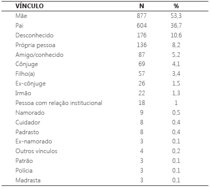 Quando correlacionados os vínculos predominantes dos autores da violência e as faixas etárias predominantes no estudo, em 393 (89,5%) casos, a mãe foi o autor da violência em casos da faixa etária de 1 a 4 anos. Entre a faixa etária 5 a 9 anos, 183 (82,8%) casos foram causados pela mãe e 136 (61,5%) pelo pai. Entre 15 a 19 anos, sobressaíram 65 (30%) casos em que o autor foi a mãe, e 58 (26,8%) que tiveram o pai como autor da violência dos 216 (100%) casos nessa faixa etária.