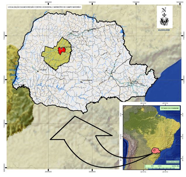 Os dados para este estudo foram coletados no Consórcio Intermunicipal de Saúde da Região da Comunidade dos Municípios da Região de Campo Mourão (CIS-Comcam), situado na região centro-oeste do estado do Paraná, mais precisamente na cidade de Campo Mourão (Figura 1). A Comcam atende a 25 municípios, totalizando uma população de 339.787 mil habitantes9. O CIS-Comcam é uma instituição pública mantida pelo Sistema Único de Saúde (SUS).