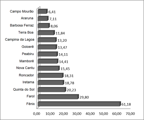 Quanto aos municípios de Farol e Fênix, que apresentaram maior incidência de tuberculose, ambos têm clima subtropical úmido mesotérmico e alto índice de desenvolvimento humano (IDHM), com 0,715 e 0,716 para Farol e Fênix, respectivamente.15Entretanto estes são os municípios com menores índices de esgotamento sanitário (1,5% e 5,1%, respectivamente) dentre aqueles investigados neste estudo.12 Este dado reflete as condições higiênico-sanitárias precárias em que a população é submetida. Indicadores como o coeficiente de Gini ou índice de Gini apontam para desigualdades sociais e poderiam ser usados em estudos com coleta de dados relativos à renda familiar, suprindo uma limitação deste estudo.
