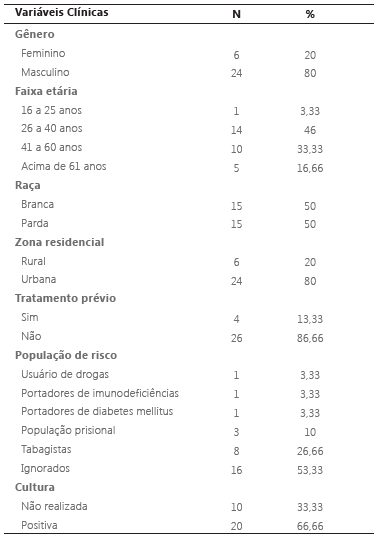 Dos pacientes com baciloscopia positiva, 80% são do gênero masculino. A faixa etária mais acometida foi de 26 a 40 anos e 80% dos casos se concentraram na zona urbana. Os dados socioepidemiológicos dos pacientes com baciloscopia positiva estão descritos na Tabela 1.
