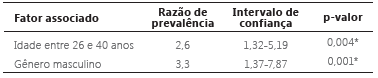 Portanto, percebe-se que aqueles com idade entre 26 e 40 anos e os homens apresentaram, respectivamente, 2,6 e 3,3 vezes mais chances de contrair a tuberculose. Alguns dos pacientes com tuberculose estão inseridos em um grupo que apresenta predisposição à doença, como os tabagistas (26,66%), os portadores de imunodeficiências (3,33%) e a população prisional (10%), porém neste estudo não foram encontradas associações significativas entre essas variáveis.