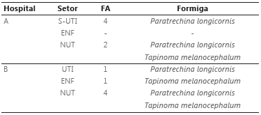 Foram realizadas, em cada hospital, três coletas em cada um dos setores hospitalares, perfazendo 18 coletas ao longo do período de estudo. Totalizaram-se 54 tubos de estudo, dos quais 36 foram experimentais (18 no hospital A e 18 no hospital B) e 18 de controle (9 no hospital A e 9 no hospital B). Cada setor de estudo do hospital recebeu 12 tubos experimentais (6 no hospital A e 6 no hospital B). A frequência de tubos experimentais das armadilhas montadas que tiveram êxito na captura de formigas e respectivo local de coleta são expressos na Tabela 1.