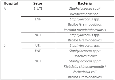 O isolamento de Staphylococcusspp. foi o mais frequente, sendo encontrado em todos os tubos experimentais positivos para bactérias. Bacilos Gram-positivos foram identificados nos setores de enfermaria (hospital A) e nutrição (hospital A e B), ainda que não associados diretamente com formigas capturadas pelas armadilhas. Verificou-se o crescimento de cepas de E. coli nos setores de enfermaria e nutrição do hospital B, associando-se com formiga coletada no primeiro setor citado. Ademais, houve crescimento de microrganismos do gênero Klebsiella, identificando-se K. ozaenae no setor de S-UTI do hospital A e K. rhinoscleromatis no setor de nutrição do hospital B, ambas em associação com amostras de formigas dos respectivos locais. Yersinia pseudotuberculosis foi identificada no setor de enfermaria do hospital A.