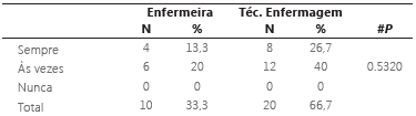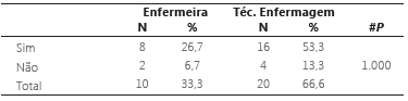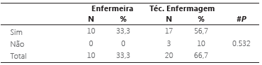 Para a variável realização da sorologia anti-HBS, 100% dos enfermeiros relataram ter realizado o exame, frente a 85% dos técnicos de enfermagem (p=0.532).