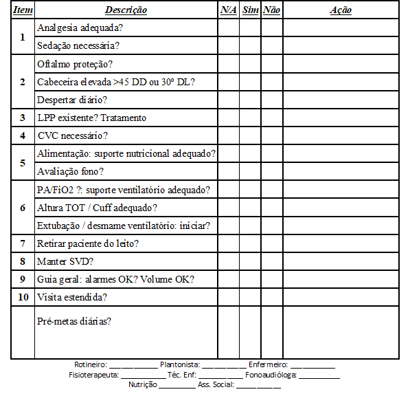 Foi elaborado um instrumento pela equipe interdisciplinar, formada por especialistas da área: enfermeiro, médico, farmacêutico e fisioterapeuta, denominado “Fast checklist – Prevenção de Iras”, com base nas recomendações propostas pelo CDC. Este instrumento é composto por 17 itens com respostas fechadas, que contempla os seguintes aspectos: higiene, posicionamento no leito, sedação, alimentação, retirada de itens invasivos, suporte ventilatório e novas metas (Quadro 1).