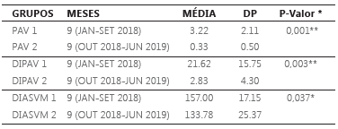 Os dados mostram que antes da implantação do protocolo fast checklist a média de PAV era de 3,22 e, após a instituição do instrumento, este valor reduziu significativamente para uma média de 0,33 (p=0,001). Condição semelhante foi observada para os dias de VM. Anteriormente ao uso do instrumento, a média de uso de VM era de 157 dias, e com a aplicação do fast checklist ela caiu para 133 dias, o que representa uma redução média de 24 dias, sendo esta significativa (p=0,037). A DIPAV também teve queda significativa de 21,62 para 2,82 após a aplicação do instrumento (p=0,003).