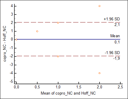 A análise gráfica pelo método Bland-Altman mostrou existir concordância entre os dois métodos de identificação de cistos avaliados, quando se plotam as diferenças entre a quantidade de cistos contra as médias de ambos os valores, já que a maioria dos valores plotados permaneceu dentro do limite de concordância de ± 1,96 DP (Figuras 1 e 2). Não foi possível comparar a quantidade de cistos nas amostras não contaminadas (Figura 3), sendo assim, é inviável o cálculo da especificidade diagnóstica.