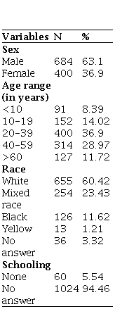 A form with 11 variables was created for data collection, and they were separated into three areas: 1) related to the victim: sex, race, age, and education; 2) related to the accident: type of accident, month of the accident, the time elapsed between the bite and medical care; and, 3) related to clinical manifestations: classification and evolution of the case.