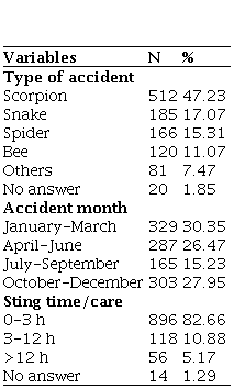 The most reported type of accident was caused by scorpions (47.23%), followed by snakes (17.07%), spiders (15.31%) and bees (11.07%). When observing the ten-year period of the study, accidents with venomous animals occurred predominantly in February (11.99%) and less frequently in September (4.34%). When the last three years (2015-2017) were evaluated, the period with the highest number of occurrences covered the months between October and December. The time between the bite and medical care was also one of the variables analyzed, and most occurred within one hour (56.83%), but there were still cases in which medical care was provided after 24 hours (2.86%) (Table 2).