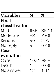 Regarding the outcome of the accident, most obtained a mild final classification (89.11%), and only 2.77% were considered serious. Almost all cases resulted in the cure of patients (98.80%), although one death was recorded in 2012 (Table 3).