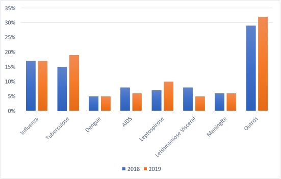 Tuberculose: Tuberculosis / Leptospirose: Leptospirosis / Leishmaniose Visceral: Visceral Leishmaniasis / Meningite: Meningitis / Outros: Others