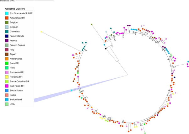 Figure 1 - Maximum-likelihood tree from the first SARS-CoV P.1 genome identified in Rio Grande do Sul (Brazil) contextualized on 156 P.1 genomes from worldwide. The aLRT support values are shown in key nodes. Tip colors indicate the origin of samples. Triangles are indicating the samples from three patients from Amazonas (Brazil), transferred to Rio Grande do Sul to receive hospital care. The first SARS-CoV P.1 genome identified in Rio Grande do Sul it is highlighted in purple.