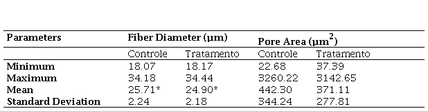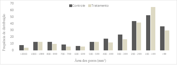 The minimum, maximum and mean values of fiber diameter and pore area (Table 2) were very close with a tendency of reduction for the samples treated in autoclave when compared to the control, as observed by the distribution of the pore area showed in Figure 2.