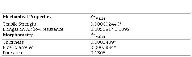 The morphometric characterization showed a significant difference for thickness and fiber diameter (Table 2). The resistance to airflow did not vary between the control and treatment masks. The mean thickness increased from 280 ± 10 µm in the control masks to 313 ± 4.4 µm in the autoclaved masks. The pore area in the autoclaved masks did not differ statistically from the control masks.