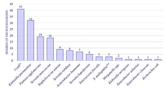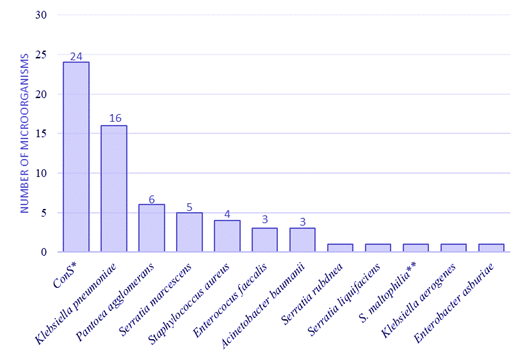 The study identified 217 microorganisms; 151 in the “Before” samples, and 66 in the “After” samples, as exhibited in Figures 1 and 2, respectively. Coagulase negative Staphylococcus (CoNS) was the most frequent, followed by Klebsiella pneumoniae.