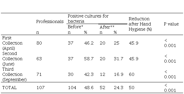 This study revealed the need for improvements concerning the hand hygiene process performed by healthcare professionals in the studied unit in order to reduce the microbial load on hands. Further studies may be conducted in an attempt to better determine the most important variables involved in this process, such as the alcohol gel amount, hygiene process and product efficiency (alcohol content, composition and gel alcohol presentation, among others). Thus, efforts are required to improve both hygiene adherence and quality, which can be demonstrated and proven by epidemiological studies involving in vitro experiments.