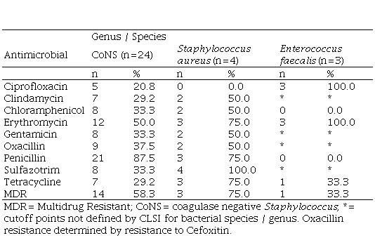 Gram-positive bacteria (DME., Brazil) were tested for the following: tetracycline (30 µg), ciprofloxacin (05 µg), chloramphenicol (30 µg), erythromycin (15 µg), clindamycin (02 µg), penicillin (10 µg), gentamycin (10 µg); sulfazotrim (25 µg), cefoxitin (30 µg) (also checking resistance to oxacillin), and vancomycin (30 µg) (only for Enterococcus spp.).