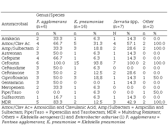 Microorganisms resistant to three or more classes of the tested antimicrobials were considered Multidrug-Resistant (MDR).15