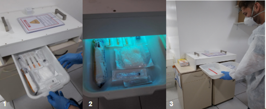 The effectiveness of UVC lamps against microorganisms on surfaces is known. At shorter wavelengths (UVC ≈ 254 nm), they are safe and have germicidal quality. For example, UVC can be effective to inactivate droplets with mycobacteria if it reaches an average irradiance of 30-50μW/cm2.18The effects of UVC irradiation result in cell damage by photohydration, photo dissection, photodimerization and photo-induced crosslinking, thereby inhibiting the replication of microorganisms. We highlight the main advantages of using this technology: it does not require changes in the ventilation of the environment; leaves no residue after disinfection; has a broad spectrum of action at fast exposure times; and the possibility of designing portable devices of simple handling until large devices, which expands the disinfection capacity, covering procedural materials, surfaces and environments.¹⁴