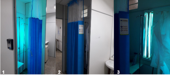 In the sector of COVID-19 patients, a “UVC closet” was built with two 60W lamps each and a motion detector device to turn them off as soon as the curtain is opened, in addition to the option of turning them on with an external switch (Figure 2). This system was evaluated for two months: in July 2020, 622 patients were hospitalized in the COVID-19 area with consumption of 434 waterproof gowns; in August, 576 patients were hospitalized in the sector, with consumption of 403 gowns. In June, the UVC system had not yet been installed, and 284 patients were hospitalized that month and 420 gowns were used. The installation of the closet meant that each patient generated the use of 0.7 gowns, on average. Without the device, 1.5 gowns are used for each patient. The savings with waterproof gowns, unit cost of R$ 7.20 (seven reais and twenty cents), was approximately R$ 3,000.00 per month. The total cost of installation and maintenance was R$ 1,000.00.