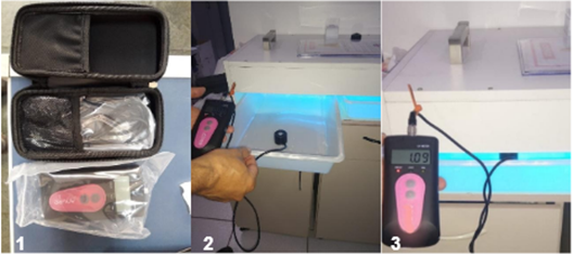 In addition to microbiological analysis, the use of a radiometer is essential to measure the real power and dose of radiation generated by UVC lamps available in Brazil (Figure 3). This was the item with the highest cost (R$ 5,000.00) in the project, but it can be used for other projects and for the provision of services in other hospitals. Radiometer measurements showed no leakage of radiation outside the pharmacy’s “UVC box”, nor outside the “UVC closet” of the COVID-19 area. In the pharmacy UVC box, the two lamps generate an average power of 1.11 mW/cm2, well above the minimum limit required by the CDC to eliminate mycobacteria, which is 30-50 μW/cm2.¹³